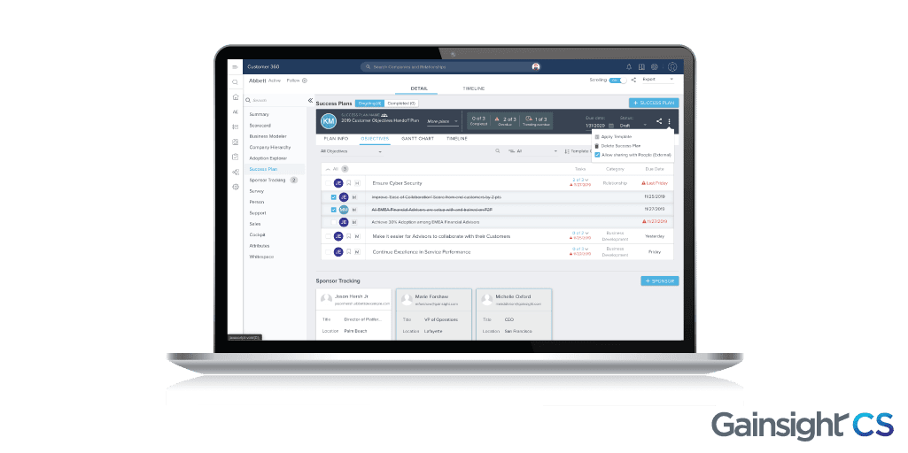 Provide customer stakeholders with visibility into their success with your product/service, enable your team to demonstrate progress against the customers’ key objectives, and hold both the CSM and customer accountable in driving the customer’s success.