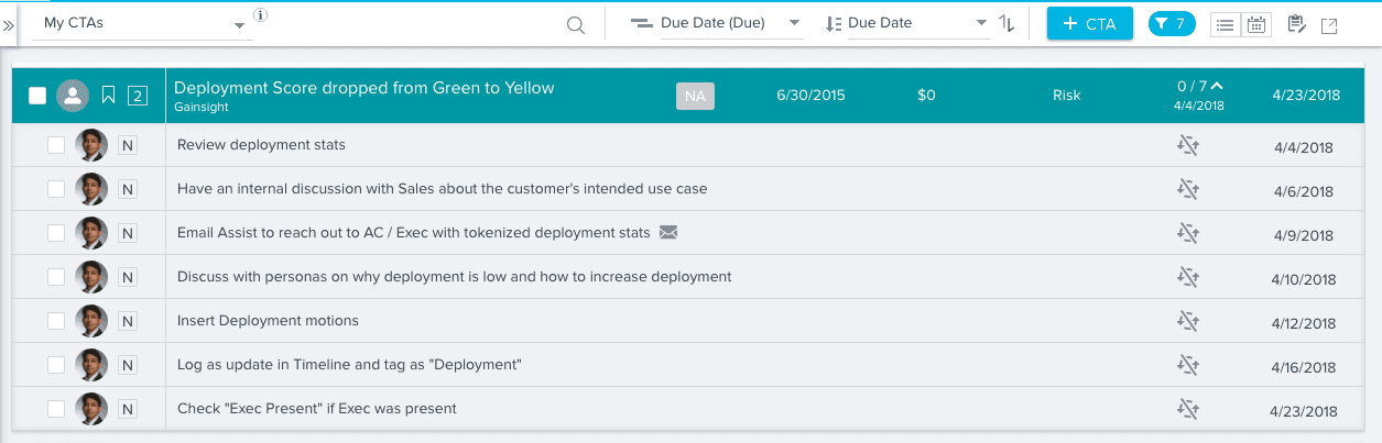 Note: You should look to add efficiencies to the end users’ playbook. Two quick ways would be to 1) Include Email Assist: These are templatized emails that CSMs can send (with edits) directly from their Call to Action (CTA) and 2) Include Linked Objects: If you expect CSMs to go into Salesforce.com to see commonly viewed Account attributes (e.g., Cases, Opportunities, etc.), show them in the CTA itself and save a few clicks.