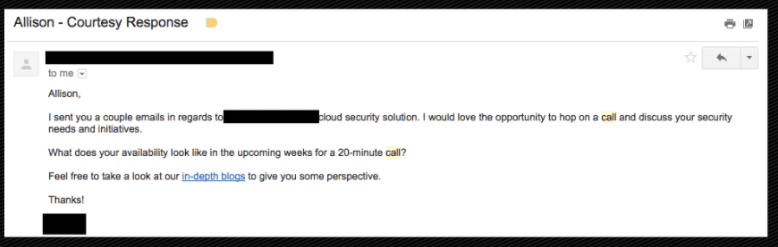Skimming through these, I found myself on an emotional journey from impatience (“Please get to the point!”), to stress (“I have no time for this”), to sympathy for the salesperson (“Poor AE…”).