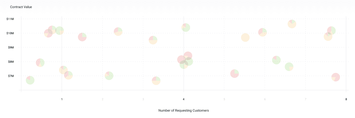 Once that data is centralized, you can share reports with your Product peer that visualizes feature requests in different ways. For example in the report below, each feature request is aggregated by contract value, number of requesting customers, and health of each of those customers. These visualizations make it easy for you to advocate for features that will move the Gross and Net Retention rates for this quarter and this year.