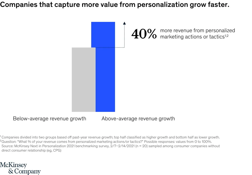 McKinsey pointed out that businesses with a firm grasp on personalization tactics had the fastest revenue growth, boosting revenue by as much as 40%. These same companies were also able to build better customer relationships, increase retention rates, increase the likelihood of purchase, and create a deeper sense of brand loyalty.