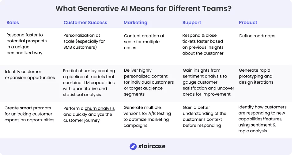 Different teams such as sales, product, support, CS, and marketing, can all benefit from Generative AI to automate and enhance various aspects of their workflows. Below are just some of the ways that each team can leverage Generative AI to gain more actionable insights and accelerate the customer journey.